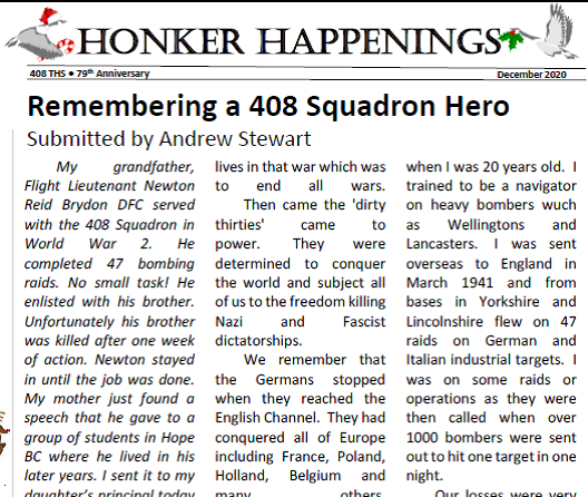 My grandfather, Flight Lieutenant Newton Reid Brydon DFC served with the 408 Squadron in World War 2. He completed 47 bombing raids. No small task! He enlisted with his brother. Unfortunately his brother was killed after one week of action. Newton stayed in until the job was done. My mother just found a speech that he gave to a group of students in Hope BC where he lived in his later years. I sent it to my daughters principal today where she read it to the whole school. I hope…